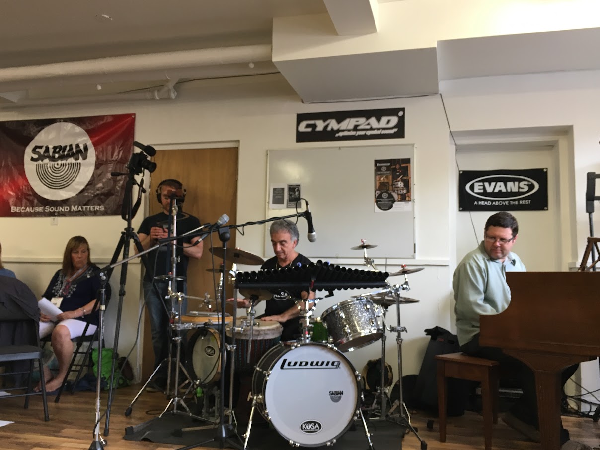 Mario DeCiutiis wowed the participants with his latest innovation: the JamKAT’R – a banjo-shaped electronic hand percussion instrument with incredible sounds and surprises. And speaking of surprises, a surprise class was inserted in the schedule by the infamous rocker, Jerry Mercer of the Canadian group April Wine, which was inspirational for those who know the history of this legendary group. The week continued with the incomparable Glen Velez who taught Asian and Arabic frame drum techniques and hypnotized everyone with his interactive vocalization and Central Asian overtone singing. Vovo Saramanda, Brazilian master percussionist, taught Brazilian rhythms and worked with the participants on Brazilian Batucada Ensemble. As the week progressed, KoSA reserved another surprise for the participants – a special concert/presentation delivered by Nanny Assis – an award-winning singer/songwriter, percussionist and drummer. He was accompanied by his trio members, Leonardo Lucini on bass and the superbly talented KoSA Faculty alumni, Arthur Lipner on vibes and marimba. This performance was so completely moving, none wanted this magical evening to come to an end.